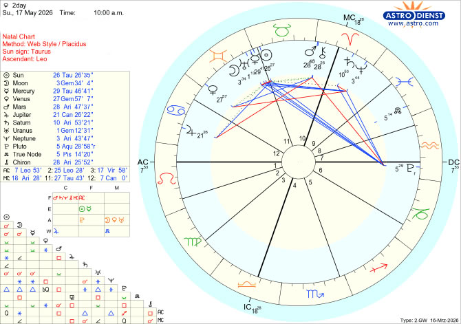 Astrological Chart for 17th May 2026 [Thanks to www.astro.com] "Blue Lines" of "Easy-Going & Healthy Relationships" "Zero Energy for The Past" => "Living a Brighter Future"